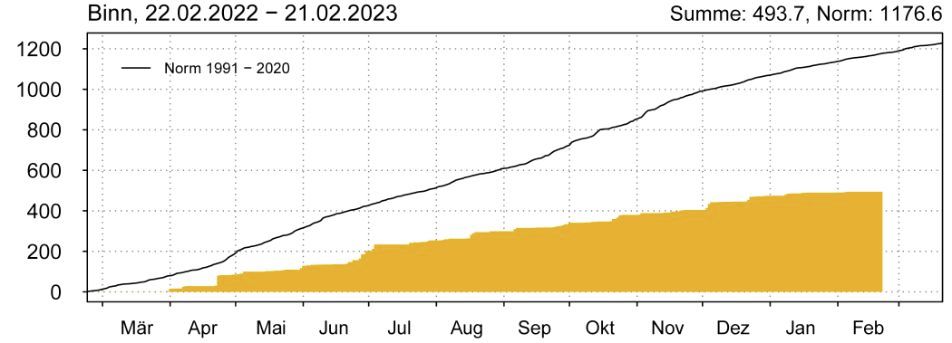 Landesweit betrachtet fiel in den vergangenen zwölf Monaten weniger Niederschlag als in der Norm 1991-2020 über den gleichen Zeitraum. In manchen Regionen fehlt ein Viertel oder gar die Hälfte einer durchschnittlichen Niederschlagsmenge über die Monate März-Februar. Die folgende orange Fläche zeigt die Niederschlagsmenge in Binn VS im Vergleich mit der Norm.