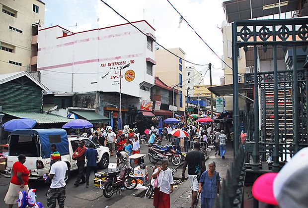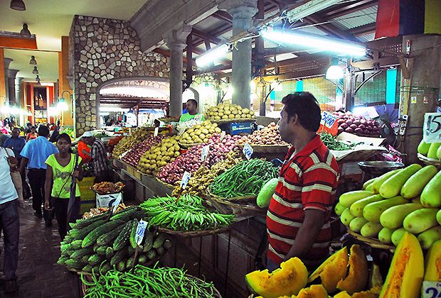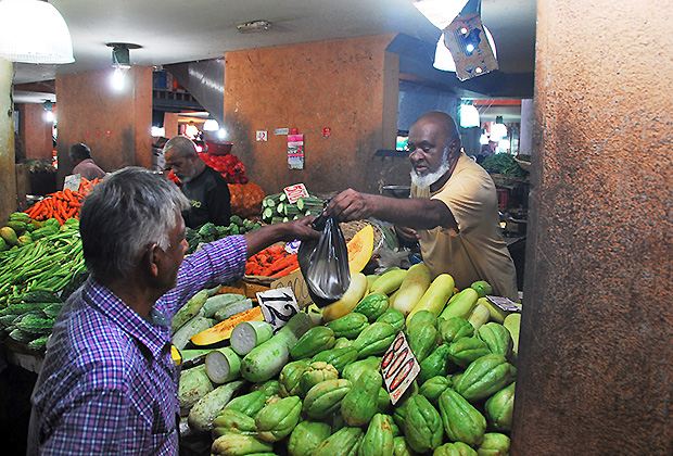 Es gibt noch einen anderen Ort, wo Lebensmittel etwas teurer sind als im Supermarkt, nämlich auf dem Markt. Der grösste Markt ist der Central Market in der Hauptstadt Port Louis. Im Herzen der Stadt liegt die grosse Markthalle, deren Besuch in vielen Reiseführern empfohlen wird. Bevor man in die Halle kommt, passiert man mehrere Strassen mit improvisierten Ständen. Überall sind Händler, die versuchen Taschen, Gürtel, Tücher und viele andere Waren zu verkaufen. Es ist laut, hektisch, drückend heiss, aber auch farbig vielfältig und fröhlich.