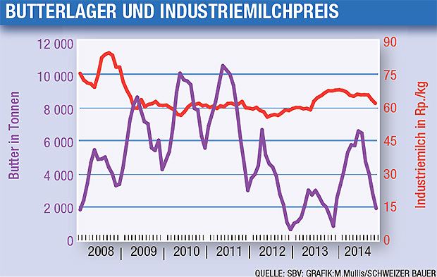 Gemäss der Branchenorganisation Butter lagen Ende März 4'285 Tonnen Butter an Lager. Damit liegen die Lager in etwa auf Vorjahresniveau, sind aber deutlich höher als Ende März 2013. Diese Tatsache ist eine Folge der gestiegenen Milchproduktion in den letzten zwei Jahren. Denn die erhöhte Milchproduktion führt zu einer Zunahme von Produkten mit geringer Wertschöpfung wie Butter und Milchpulver.