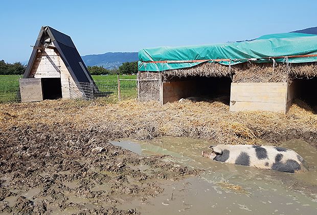 Nachhaltigkeit umfasst zahlreiche Aspekte. Neben der Umwelt-Komponente ist auch die Wirtschaftlichkeit für die Betriebe von Bedeutung. Dort gilt es teils einen Balance-Akt zu vollführen. So ist die Haltung der Turopolje-Rasse punkto Tierwohl vorbildhaft und die Fleischqualität äusserst gut, aber die Produktivität tiefer als auf einem konventionellen Schweine-Betrieb. Dasselbe gilt für die Mast-Hühner, die auf den Weiden leben.