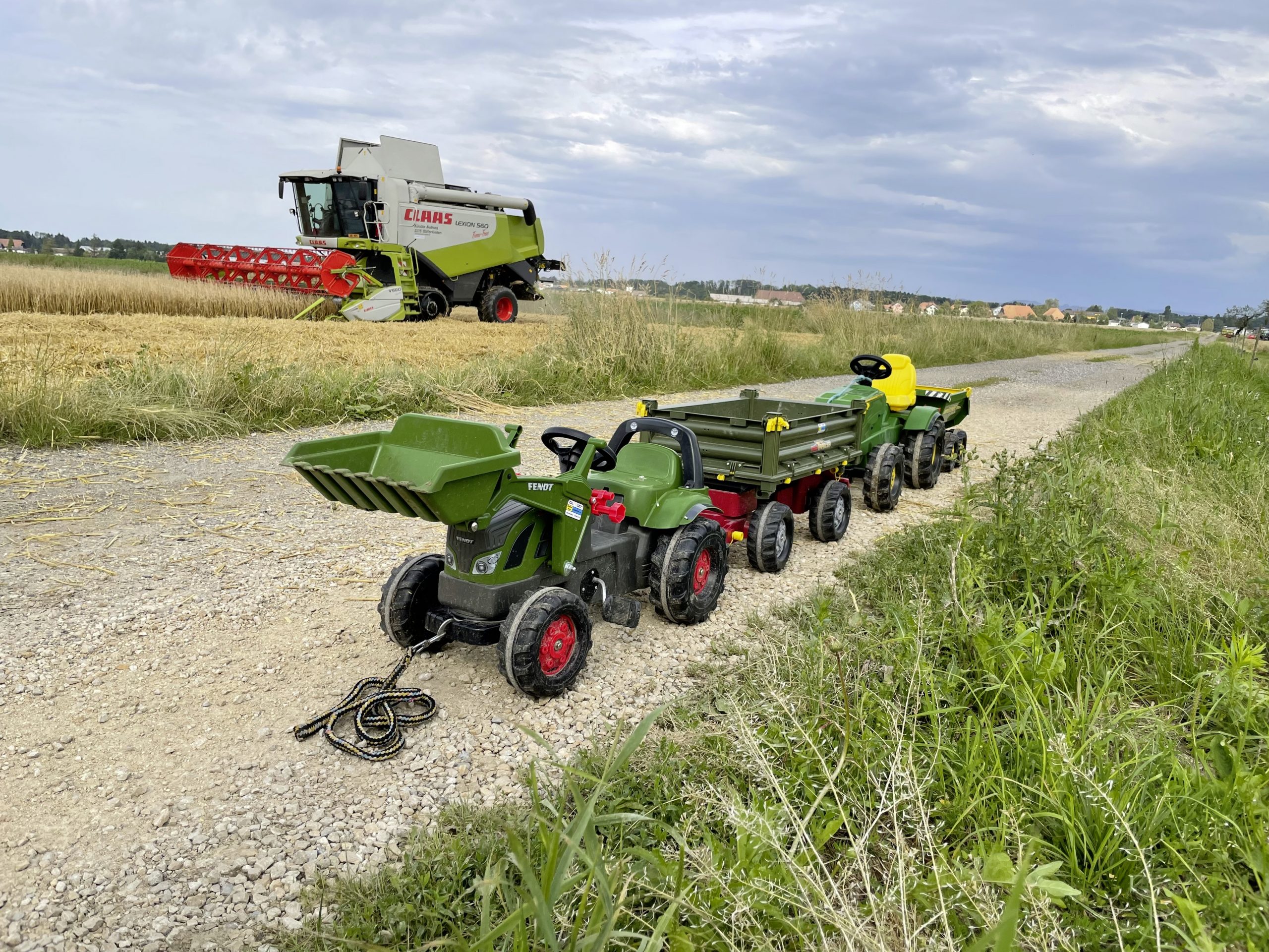 Gemeinsam mit dem Ressort Landtechnik des «Schweizer Bauer» fiel die Entscheidung dann auf das Foto von Ramona Walther aus Bätterkinden BE. Die Kinder Alina (6) und Noel (3) haben ihre Trettraktoren mit Anhänger parkiert, um ihrem Papa bei der Ernte des verhagelten Getreides zuzuschauen und natürlich, um zu helfen, die Ernte vor den nächsten Regenschauern heimzuführen. Herzlichen Glückwunsch zum Sieg!