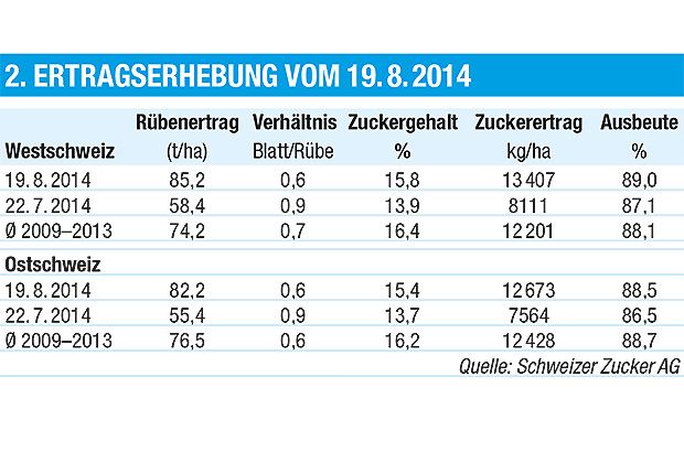 Positiv entwickelt hat sich der Zuckergehalt. Die gemessenen Werte von 16,3 Prozent in der West- und 15,4 Prozent in der Ostschweiz liegen aber nach wie vor deutlich unter dem Durchschnitt der Vorjahre. Der tiefe Krankheitsdruck und das gesunde Blattwerk lassen jedoch auf eine weitere Zunahme beim Zuckergehalt hoffen.