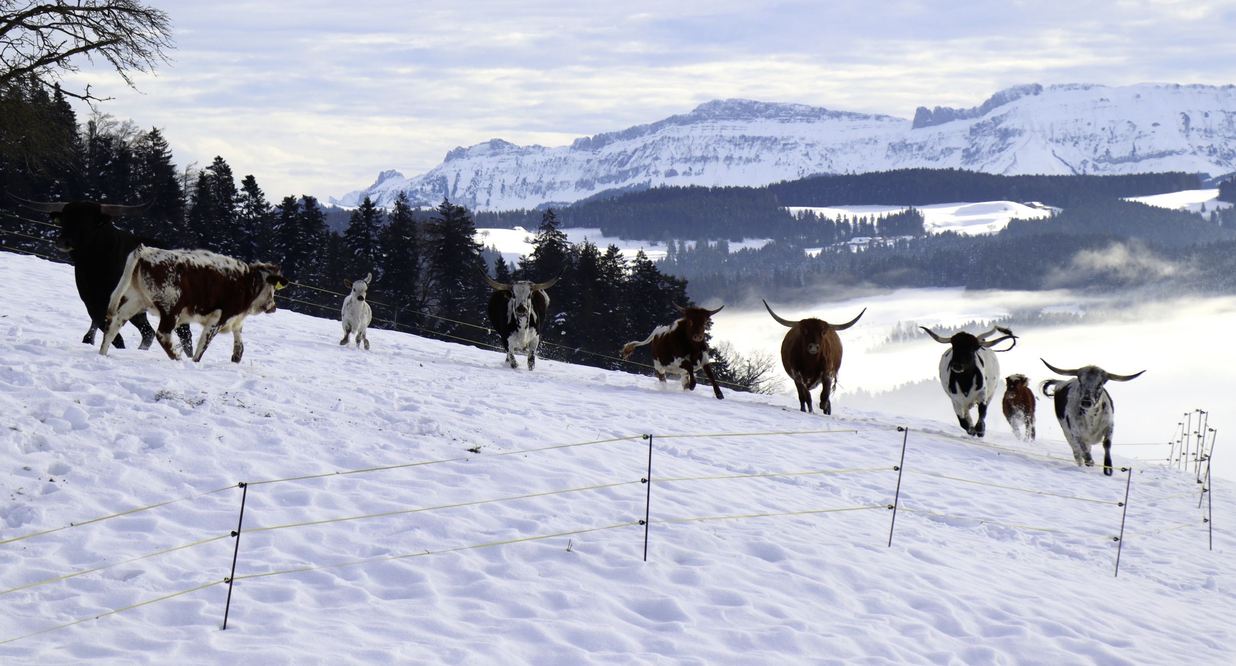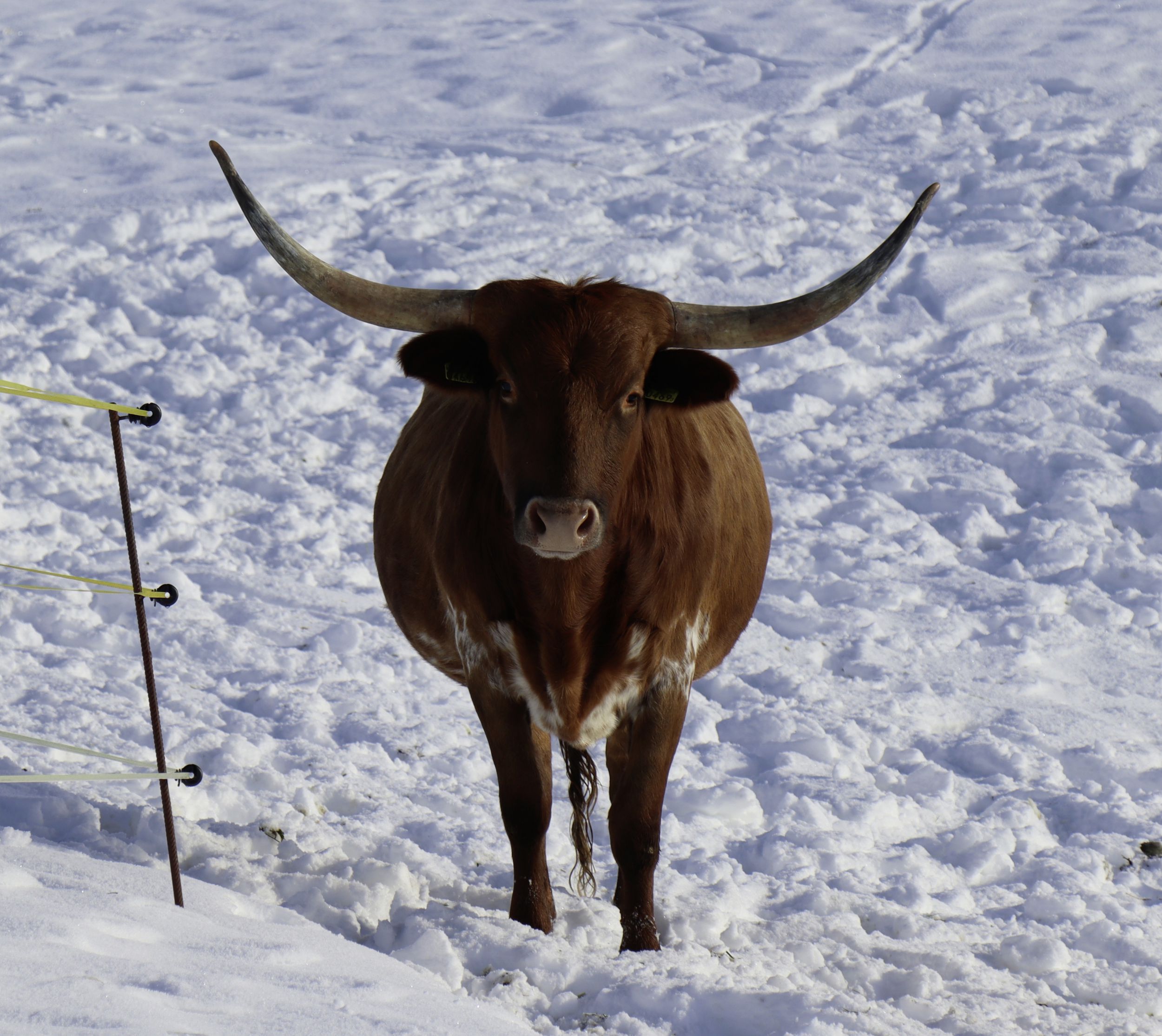 Der Schnee und das wunderschöne neugebaute Emmentaler Bauerhaus auf dem Möschberg im Oberthal ob Grosshöchstetten im Emmental erinnern nicht im Entferntesten an den amerikanischen Traum des Wilden Westens. Was im Stall steht allerdings schon: 17 verschieden gezeichnete langhornige Prärierinder – Texas Longhorns.