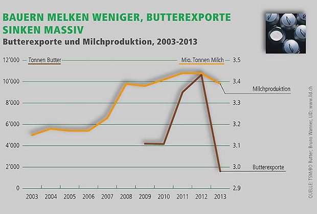 Um den Markt zu entlasten, musste massenweise Butter exportiert werden (siehe Grafik). Das kostete die Bauern Millionen. Denn Schweizer Butter findet auf dem Weltmarkt nur einen Käufer, wenn sie künstlich verbilligt wird – mit Abgaben der Milchproduzenten. Im Gefolge der Überschussproduktion erhielten die Bauern immer weniger Geld für ihre Milch. 2012 erreichten die Produzentenpreise einen historischen Tiefststand.