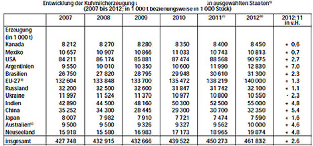 In ihrer jüngsten Marktanalyse schätzen die Washingtoner Fachleute das Kuhmilchaufkommen in den wichtigsten Erzeugerländern im Kalenderjahr 2012 auf insgesamt 461,8 Mio. t. Das wären 11,6 Mio. t oder 2,6% mehr als im Vorjahr. Für die im US-Bericht betrachteten Staaten, die zusammen etwa 80 Prozent der gesamten Welterzeugung auf sich vereinen, wird für 2011 eine Zunahme der Milcherzeugung von insgesamt 10,8 Mio. t oder 2,5 % auf 450,3 Mio t ausgewiesen.