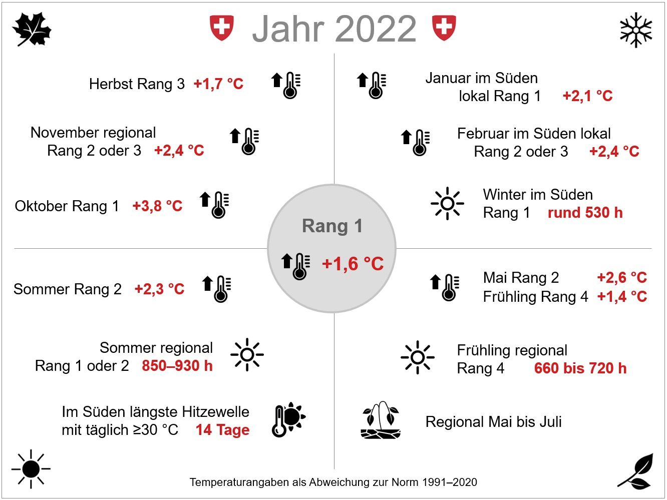 Das Jahr 2022 ist in der Schweiz das wärmste und regional das sonnigste seit Messbeginn 1864. Der Jahresverlauf war geprägt durch anhaltend überdurchschnittliche Temperaturen, viel Sonnenschein und regional anhaltenden Niederschlagsmangel.