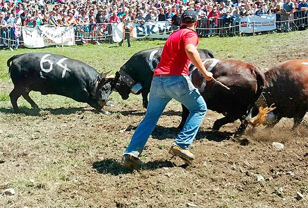97 Kühe, die meisten aus dem Oberwallis, wurden für die Teilnahme angemeldet. Eine aber kam aus Ebnat-Kappel SG, heisst Taifun, und gehört SVP-Präsident Toni Brunner. Diese hat er sich schon im April gekauft, als er in Raron zum ersten Mal einen Ringkuhkampf besuchte. Dass er nun am Sommerstechfest teilnimmt, ärgerte aber Beat Rieder, den aus dem Lötschental stammenden CVP-Ständeratskandidat. «Eringer-Kühe gehören nicht in die Politik. Wenn man aber damit anfangen will, passen die schwarzen Kühe besser zur CVP als zur SVP», liess sich Rieder zitieren. So kaufte er sich kurzerhand auch ein Rind und nahm ebenfalls teil.