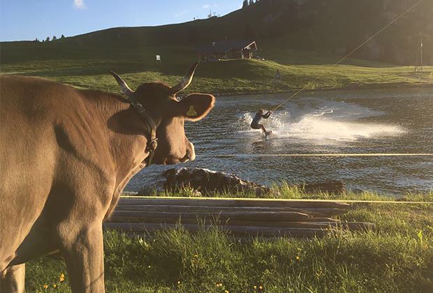 Am Samstag wird der höchstgelegene Wake-Board Lift Europas auf dem Hornbergsee ob Gstaad BE eröffnet. Rundherum sömmern Kühe, welche von nun an den Wassersportlern bei Ihren Kunststücken zusehen können. Das Projekt kam Dank einem Crowdfunding zu Stande. Mit Videos