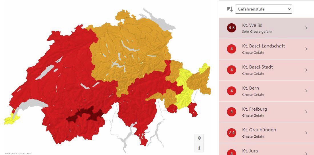 Gemäss der Definition des Naturgefahrenportals des Bundes bedeutet die Gefahrenstufe fünf, dass Waldbrände bei der Bekämpfung kaum mehr zu löschen sind. Die Gefahrenstufe fünf galt ab Dienstag.