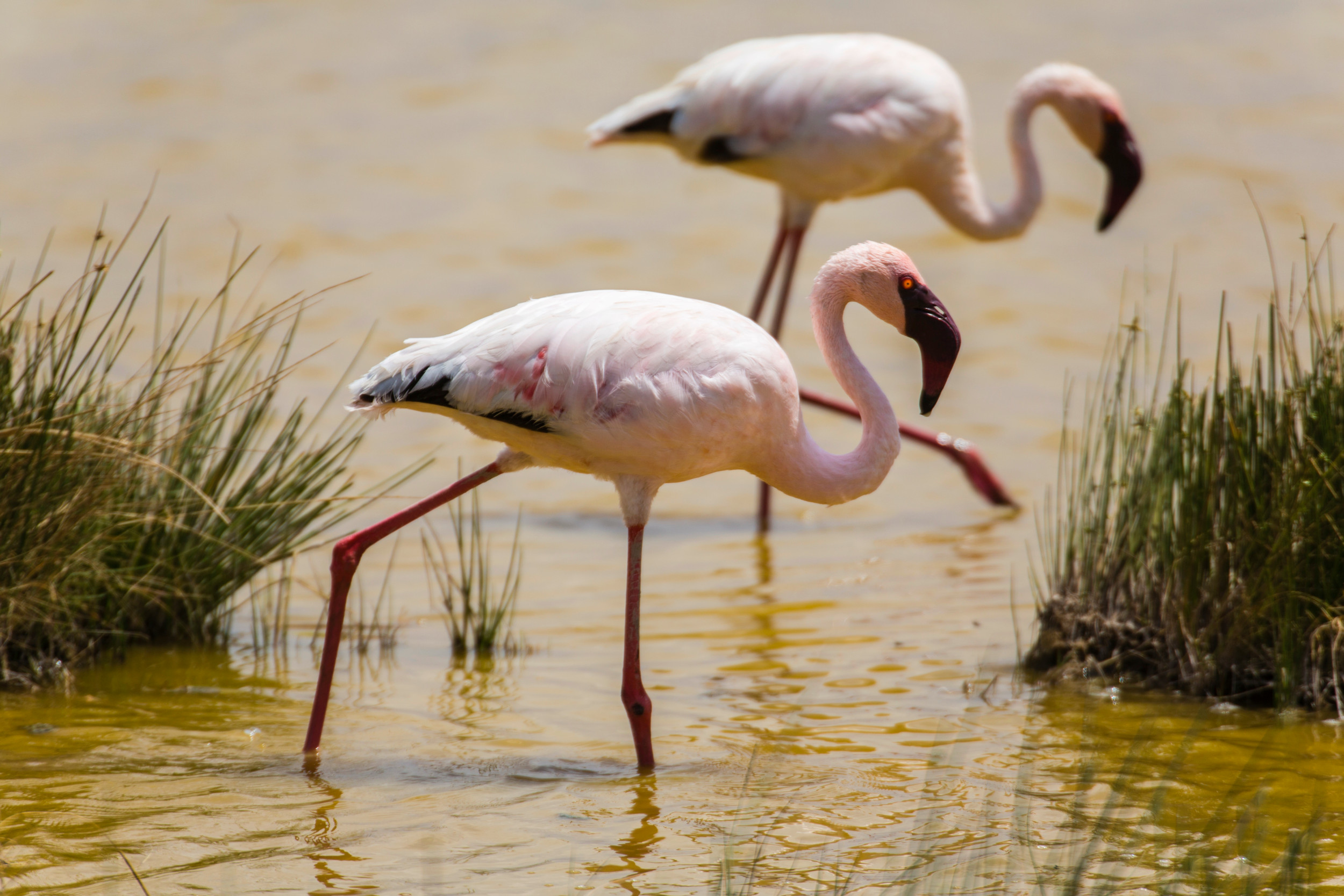 Drei Viertel der Zwergflamingos auf der Welt leben in Ostafrika. An den Seen können sich mehr als eine Million Vögel gleichzeitig einfinden, um dort zu fressen und zu balzen. Die Vögel mit dem rosafarbenen Gefieder haben spezielle Schnäbel, mit denen sie eine besondere Algenart aus dem See picken, die in salzigen, alkalischen Gewässern vorkommt – sogenannten Sodaseen.