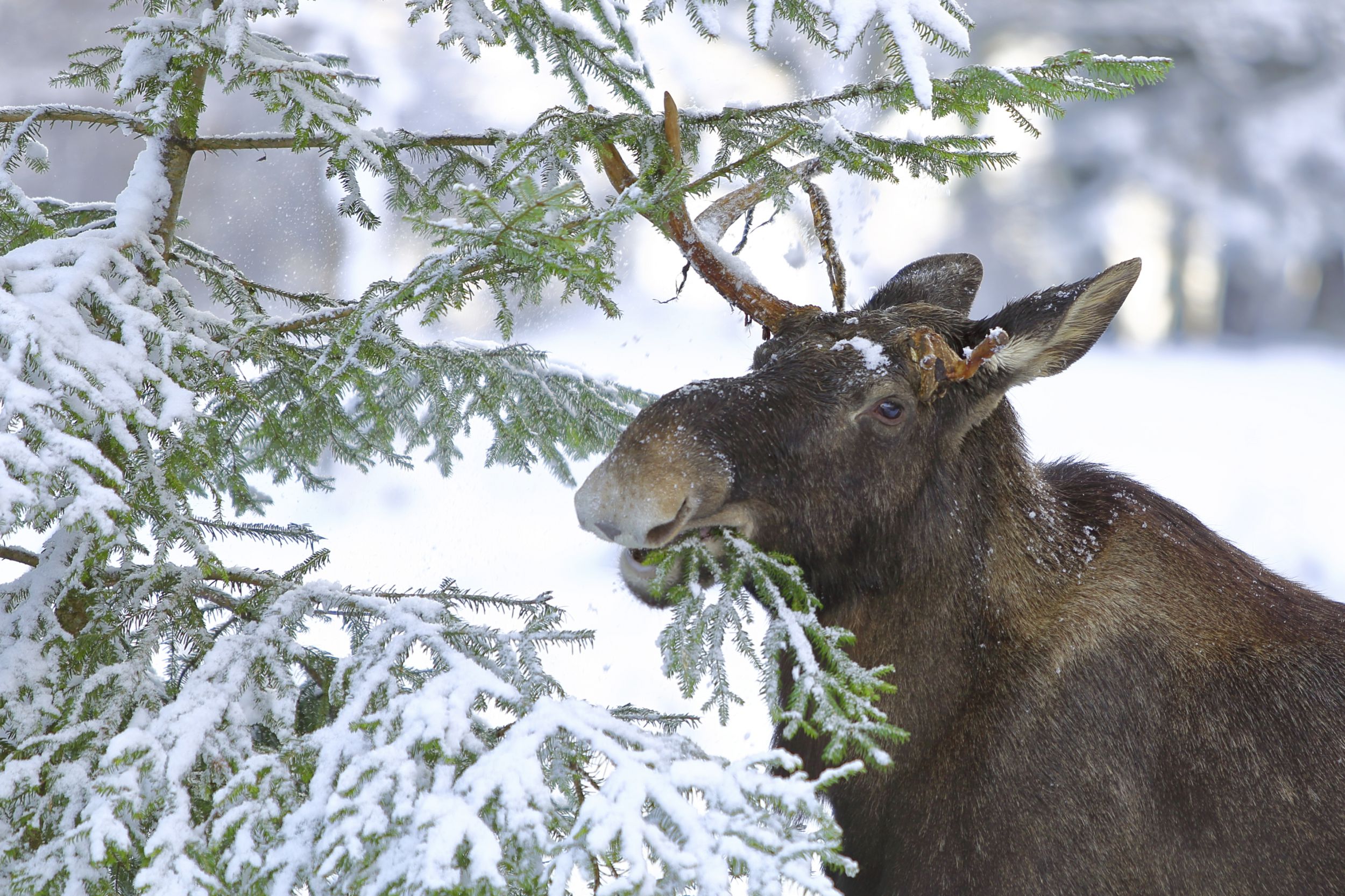 Reste wird es kaum geben: Ein ausgewachsener Elch frisst vier bis sechs Nadelbäume pro Tag. Die Tiere lieben vor allem die nährstoffreichen Pflanzenteile wie Zweige, Knospen und Nadeln – die Feinschmecker und Futterspezialisten suchen ihre Nahrung also ganz gezielt aus. Im Frühling, Sommer und Herbst fressen Elche Salweiden, Birken, Hasel, Buchen und Ahornbäume.