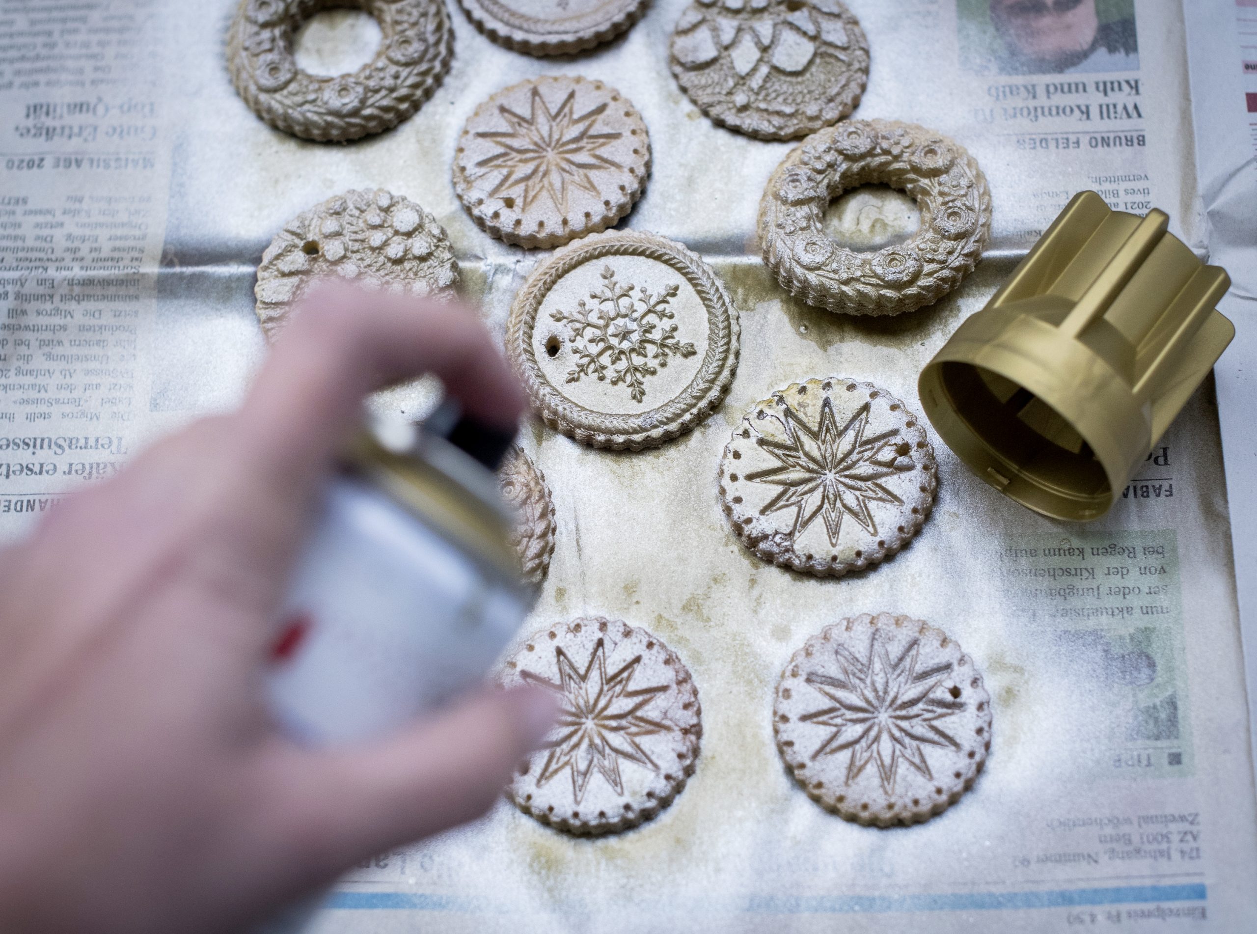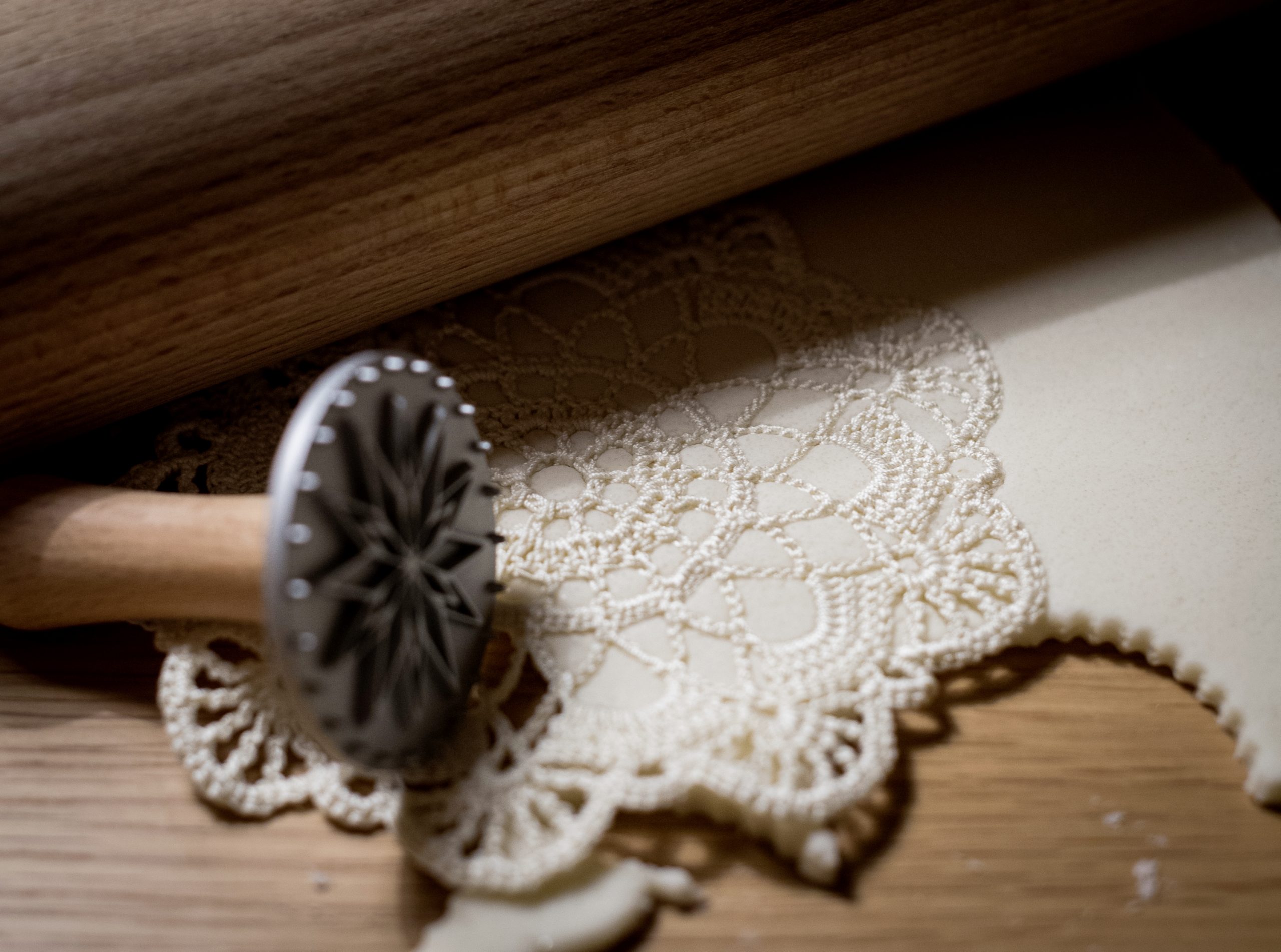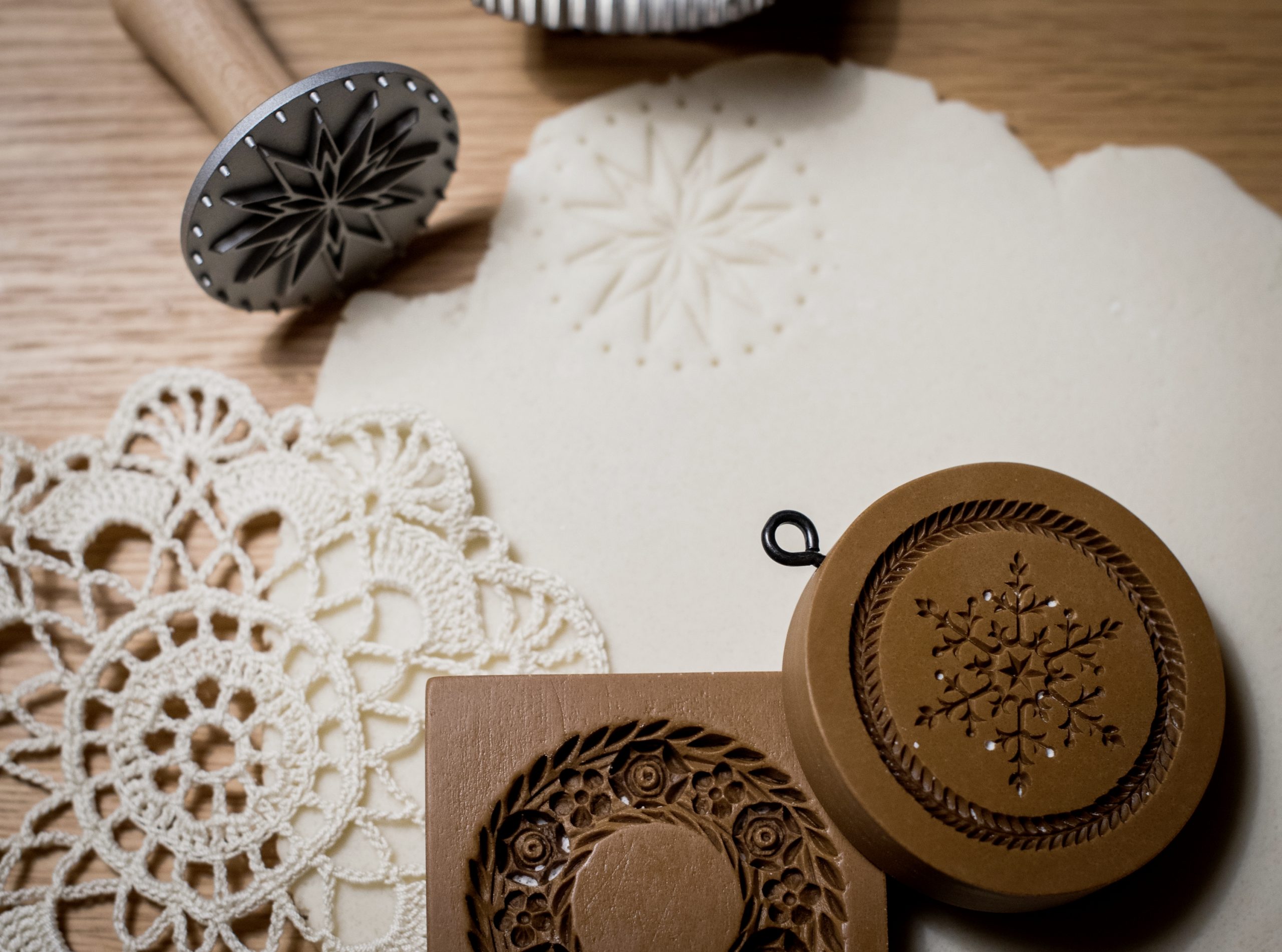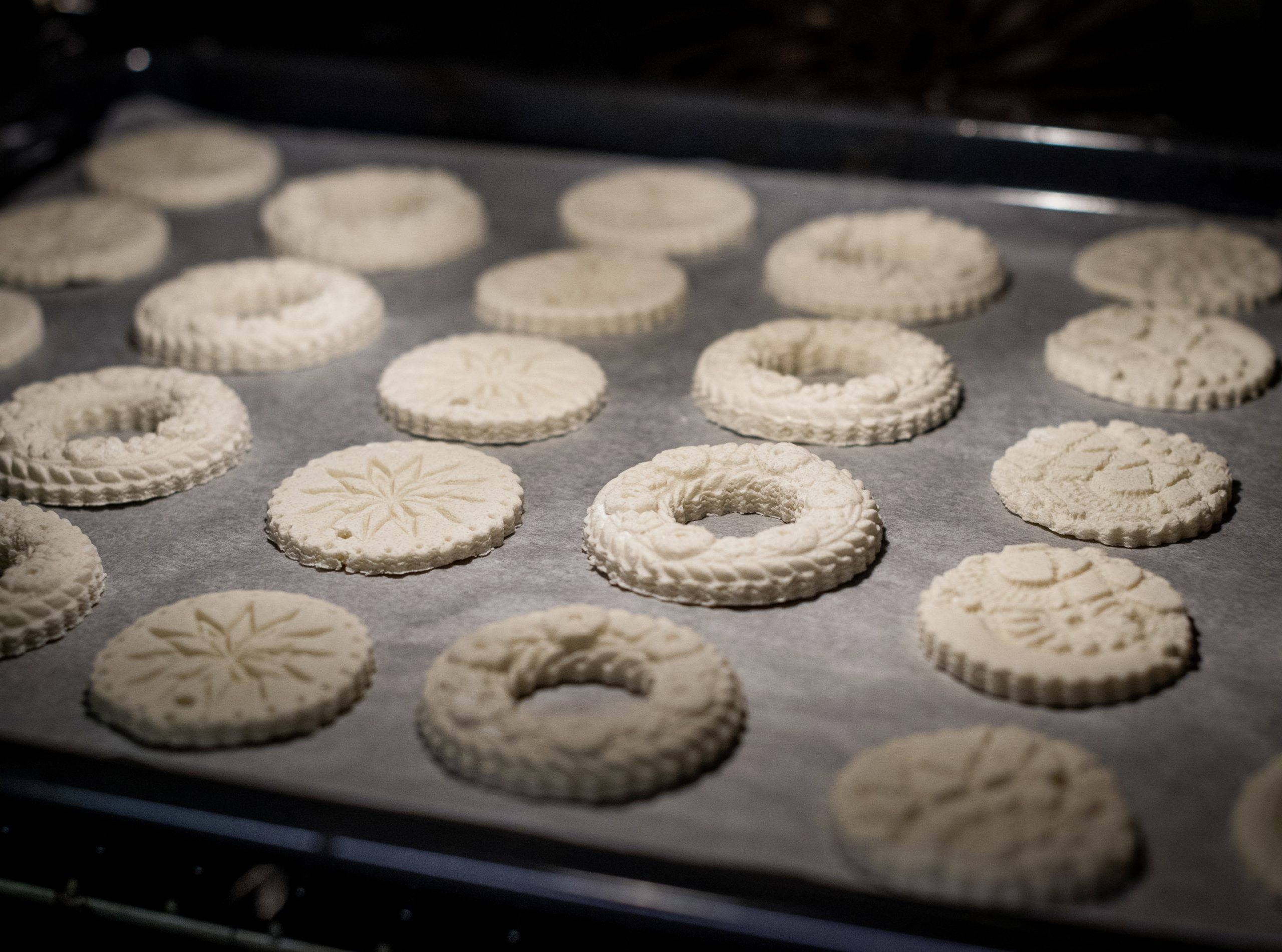 Wenn der Teig die richtige Konsistenz hat, kann er problemlos weiterverarbeitet werden. Sollte er etwas zu feucht sein, kann fürs Formen nochmals etwas Mehl zugefügt werden. Den Teig knapp einen Zentimeter dick auswallen und dann mit verschiedenen Mitteln prägen. Wer hat, kann gut ein Anismodel verwenden, da sich Salzteig sogar noch fast besser formen lässt als Anisteig. Optional können auch mit Spitzendeckchen oder Spitzenbordüren schöne Muster in den Teig geprägt werden. Keine Angst: Salzteig macht keine Flecken, und die Spitze kann danach problemlos wieder gereinigt werden.