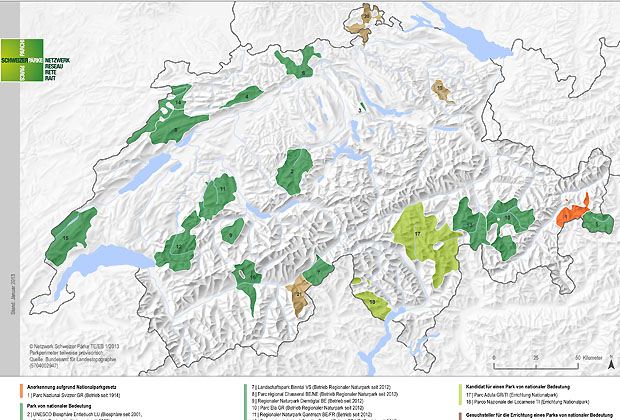 Seit dem 1. Januar 2013 zählt die Schweiz 14 regionale Naturpärke in Betrieb mit dem Label «Schweizer Pärke»: Beverin, Binntal, Chasseral, Diemtigtal, Doubs, Ela, Entlebuch, Gantrisch, Gruyère Pays-d'Enhaut, Jurapark Aargau, Jura vaudois, Pfyn-Finges, Thal und Val Müstair.