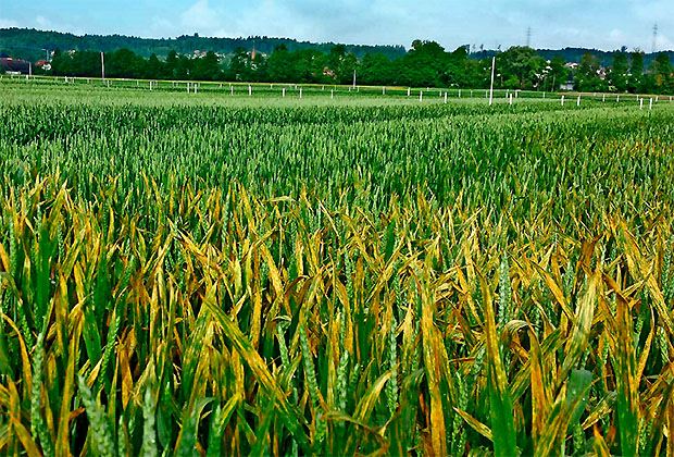 Der Gelbrost tritt erstmals seit 14 Jahren wieder flächendeckend auf. Befallene Getreideblätter verdorren. Das hat gravierende Folgen. Markus Hochstrasser von der Fachstelle Pflanzenschutz des Kantons Zürich: «Weizen, der schon die Blätter verliert, wird wohl massiv weniger Ertrag bringen.» Er rechnet mit Einbussen bis zu 50 Prozent oder mehr, wenn es kühl bleibt und auch die Ähre befallen wird. Auch Jordi schätzt, dass in unbehandelten, stark befallenen Parzellen nur die Hälfte einer normalen Ernte gedroschen werden kann.