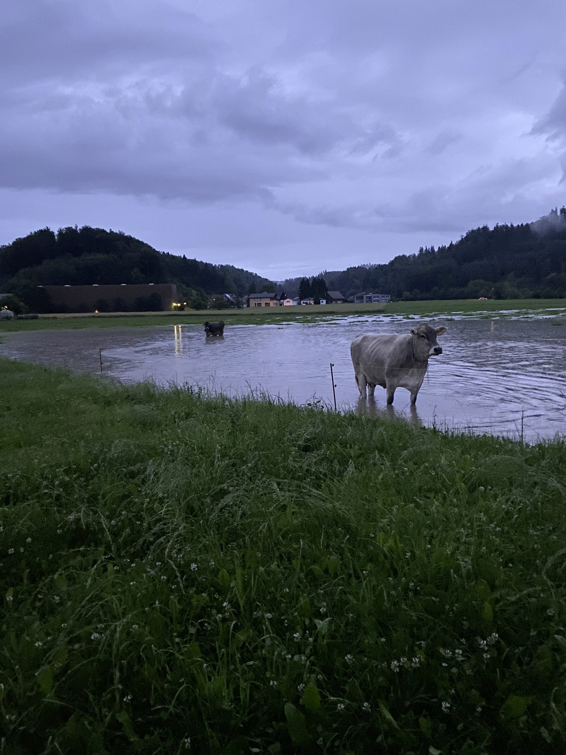 Weil die Landwirtschaft und generell das Leben nicht nur «Sommer, Sonne, Sonnenschein» ist, haben wir in dieser Woche unsere Leserinnen und Leser höflich angefragt, uns Bilder zu senden, um aufzuzeigen, wie es bei ihnen daheim in der vergangenen Woche ausgesehen hat. Da stehen Kühe auf einer Weide, welche aber keine Weide mehr ist, sondern einem See gleicht. Einige Fotos wurden uns von überschwemmten Kulturen und Bächen gesandt, wo sonst keine sind.