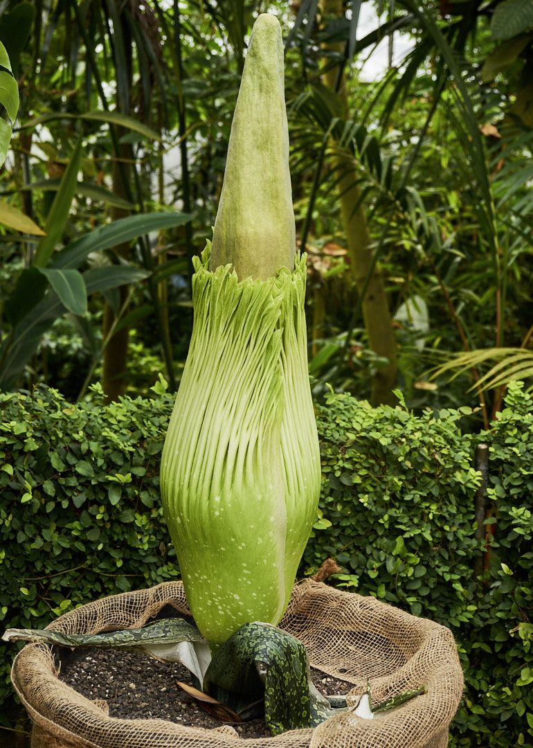 Am Mittwoch war die Pflanze bereits 110 Zentimeter gross, während sie am Montag noch 97 Zentimeter gemessen hatte, wie auf der Website des Botanischen Gartens zu sehen ist. Wenn die Blume – deren lateinischer Name etwa mit «missgestalteter Titanenpenis» übersetzt werden kann – ihre Blütenpracht entfaltet, verströmt sie Aasgeruch.