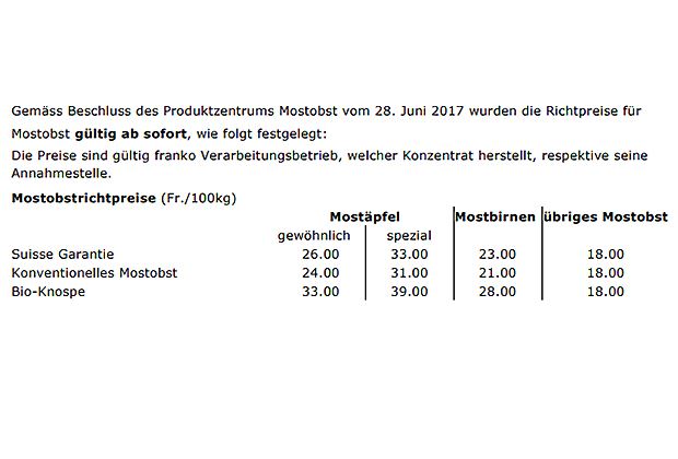 Obwohl die Erntemenge tief ausfällt und das Mostobst gesucht ist, wurden die Richtpreise nicht erhöht. Das Produktzentrum Mostobst hat aber beschlossen, auf den Rückbehalt zu verzichten.