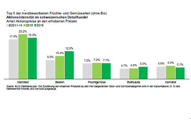 Im Vergleich zu 2015 gab es vergangenes Jahr 7 Prozent weniger Aktionen bei Obst und Gemüse, wie der aktuelle Marktbericht des BLW-Fachbereichs Marktanalyse zeigt. Verglichen mit dem 5-Jahres-Schnitt lag der Wert um 4,5 Prozent tiefer.