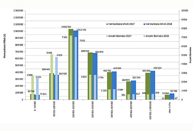 Die 17‘060 Milchproduzenten mit einer Produktion von bis zu 300‘000 kg erreichen zusammen eine Milchmenge von insgesamt 2‘129‘053 Tonnen oder 63.7 Prozent der Gesamtproduktion. Die 2‘508 grössten Milchproduzenten mit einer Menge von über 300‘000 kg tragen bereits über einen Drittel oder 1‘210‘741 Tonnen (36.3 Prozent) zur Jahresproduktion bei.