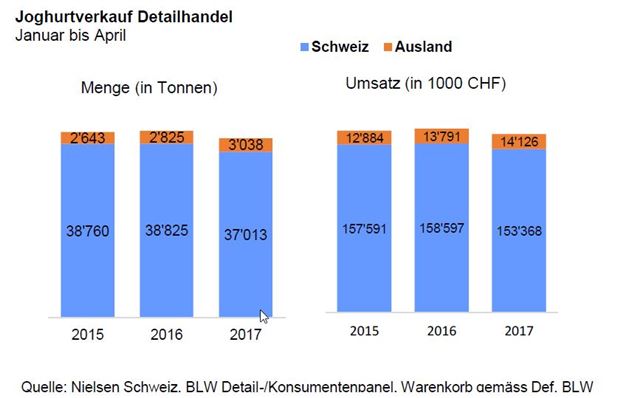 Beim Joghurt ist der Umsatz um 2,8 Prozent zurückgegangen, wobei die Verkäufe um 3,8 Prozent abnahmen. Dabei wurde 4,7 Prozent weniger Schweizer Joghurt verkauft, während die ausländische Menge um 7,5 Prozent angestiegen ist. Der Anteil des ausländischen Joghurts liegt bei 7,6 Prozent, zum Vorjahreszeitpunkt hatte er 6,8 Prozent betragen.