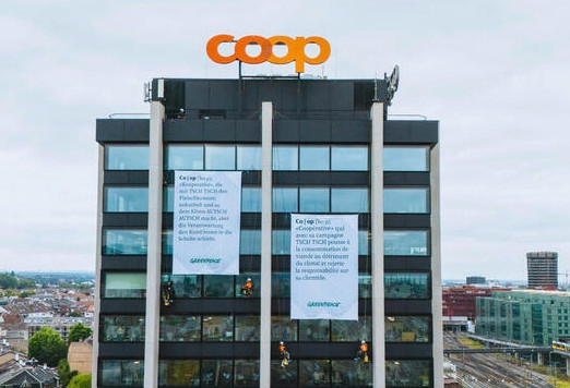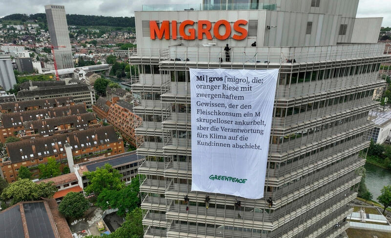 An den Fassaden der Hauptsitze von Coop und Migros, in Basel und Zürich, entrollten Greenpeace-Aktivisten riesige Banner. So steht auf dem Plakat, dass über das Migros-Gebäude gespannt ist, folgende Aussage: «Migros, oranger Riese mit zwergenhaften Gewissen, der den Fleischkonsum ein M skrupelloser ankurbelt, aber die Verantwortung fürs Klima auf die Konsumenten abschiebt.»