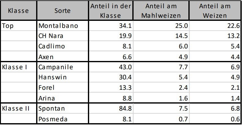 Bei den Anteilen der Qualitätsklassen von Brotweizen nehmen die Klassen I und II zu Gunsten der Klasse Top weiter ab. Den grössten Anteil weist die Klasse Top mit 73.2% (2022: 64.0%) auf, gefolgt von der Klasse I mit 17.8% (2022: 25.6%) sowie der Klasse II mit 8.9% (2022: 9.6%).