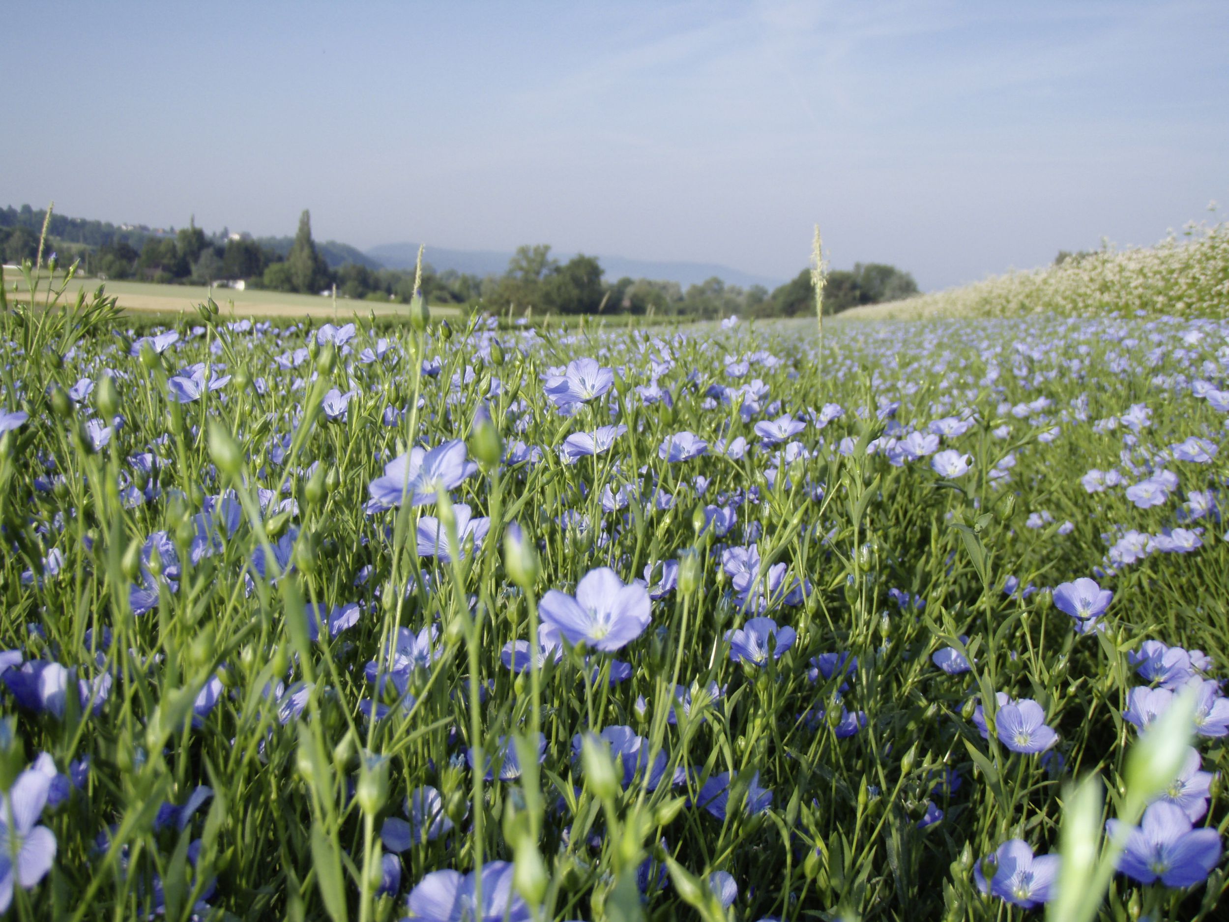 Der blühende Lein mutet im Juni wie ein Sommernachtstraum in Blau an. Die zarten Blüten sind ein beliebtes Fotomotiv und absoluter Anziehungspunkt für Passanten – sie sorgen für ein tolles Bild der Schweizer Landwirtschaft.