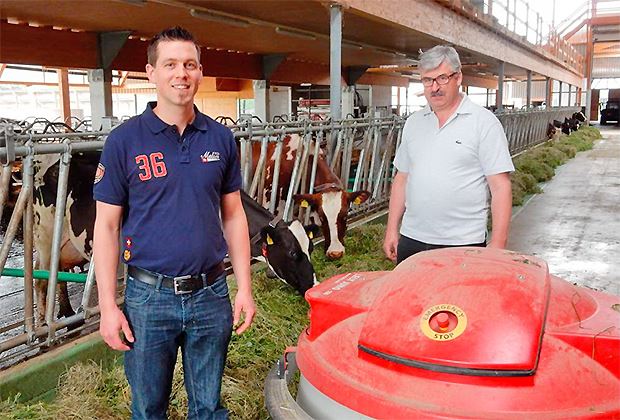 «Wenn wir frisches Gras abladen, kommen die Kühe schon an den Futtertisch», beobachtet Schwager, «doch wir haben einen automatischen Futterschieber, den Lely Juno, sodass immer genug Ration vorliegt. Das ist besonders wichtig, wenn man Gras füttert.»