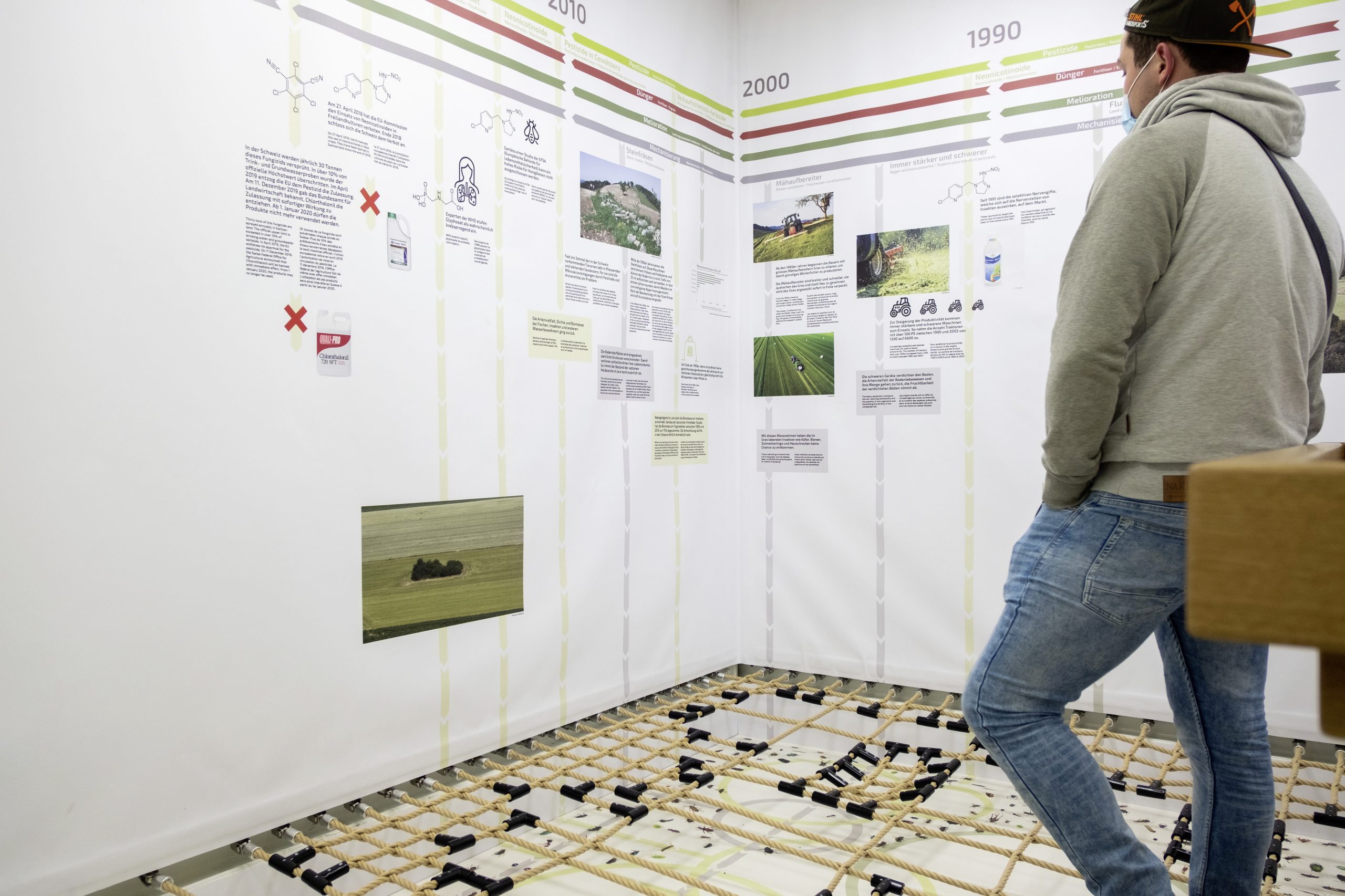 Das Thema wird dann problemorientiert beschrieben, zusätzliche Informationen können über Tablets, mit denen die Besucherinnen und Besucher am Eingang ausgerüstet werden, abgerufen werden. Als Kontrast wird in Porträts die Sicht der Bauern dazu dargelegt.