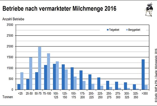 Abgenommen hat vor allem die Anzahl Betriebe, die weniger als 300'000 Kilo Milch pro Jahr produzieren. Das Minus belief sich 2016 auf 823 Produzenten. Dafür werden die Betriebe immer wie grösser. Die Anzahl Betriebe mit einer Jahresproduktion von über 300'000 Kilo hat 2016 um 45 zugenommen. 51 Milchproduzenten haben 2016 über eine Million Kilo Milch abgeliefert. Die grösseren Betriebe liefern fast gleich viel Milch ab, wie die knapp 3‘000 Betriebe mit einer Jahresproduktion von weniger als 50‘000 kg Milch.