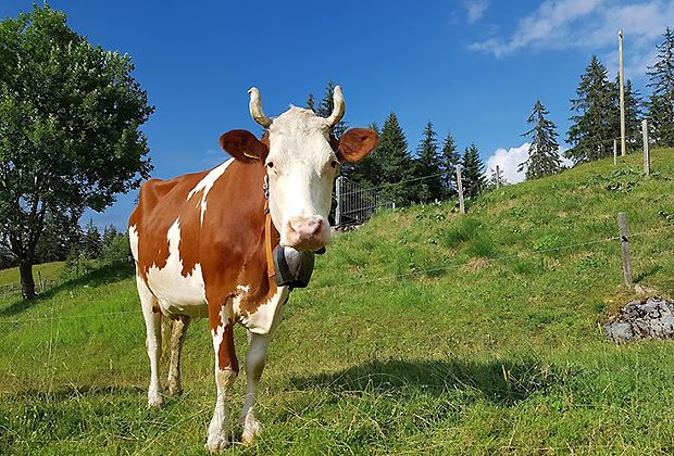 Daher gilt Schweizer Milch als Raufuttermilch. Um den Nährstoffbedarf zu decken, benötigt eine Milchkuh rund 100 kg Grünfutter oder etwa 15 kg Heu pro Tag (dazu 50 Liter Wasser). Und weil auf Schweizer Wiesen weder Insektizide gegen Schädlinge noch Fungizide gegen Pilze eingesetzt werden dürfen, hat die Milch unserer Kühe auch noch einen Qualitätsvorteil.