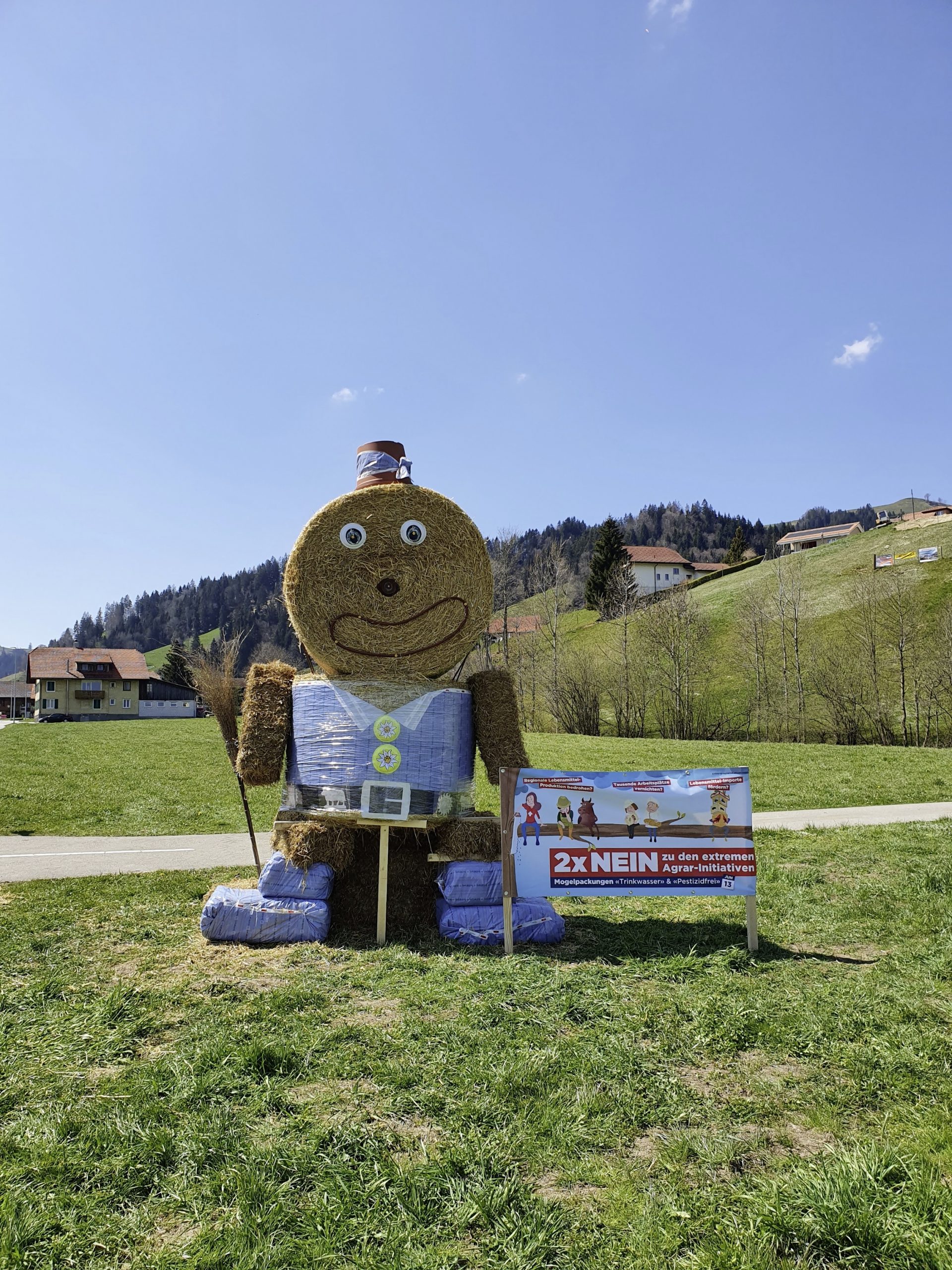 Würden die Agrarinitiativen am 13. Juni angenommen, hätte dies für die Schweizer Landwirtschaft gravierende Folgen. Deshalb stellen viele Bäuerinnen und Bauern derzeit auffällige Kreationen, meist aus Rundballen gefertigt, auf, um die Aufmerksamkeit der Bürgerinnen und Bürger zu gewinnen.