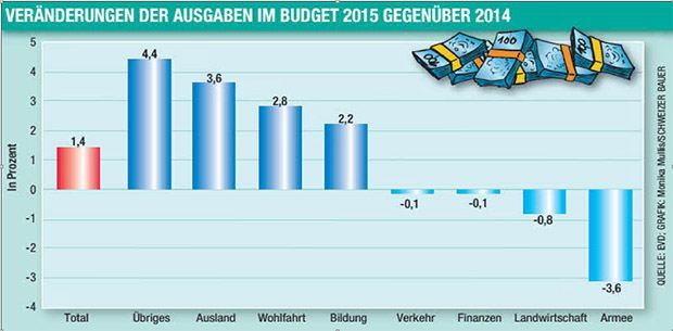 Die Beziehungen zum Ausland weisen mit 3,7Prozent das stärkste Wachstum aus. Der Kostentreiber hier ist die Entwicklungshilfe. 2015 wird für die Beziehungen zum Ausland erstmals gleich viel Geld ausgegeben wie für die Landwirtschaft. Ab 2016 werden die Ausgaben ins Ausland dann wegen der Anbindung der Entwicklungshilfe an das Bruttoinlandsprodukt (BIP) definitiv das Agrarbudget überholen. Denn das Parlament hat sich selber auferlegt, mindestens 0,5% des BIP in die Entwicklungshilfe zu geben.