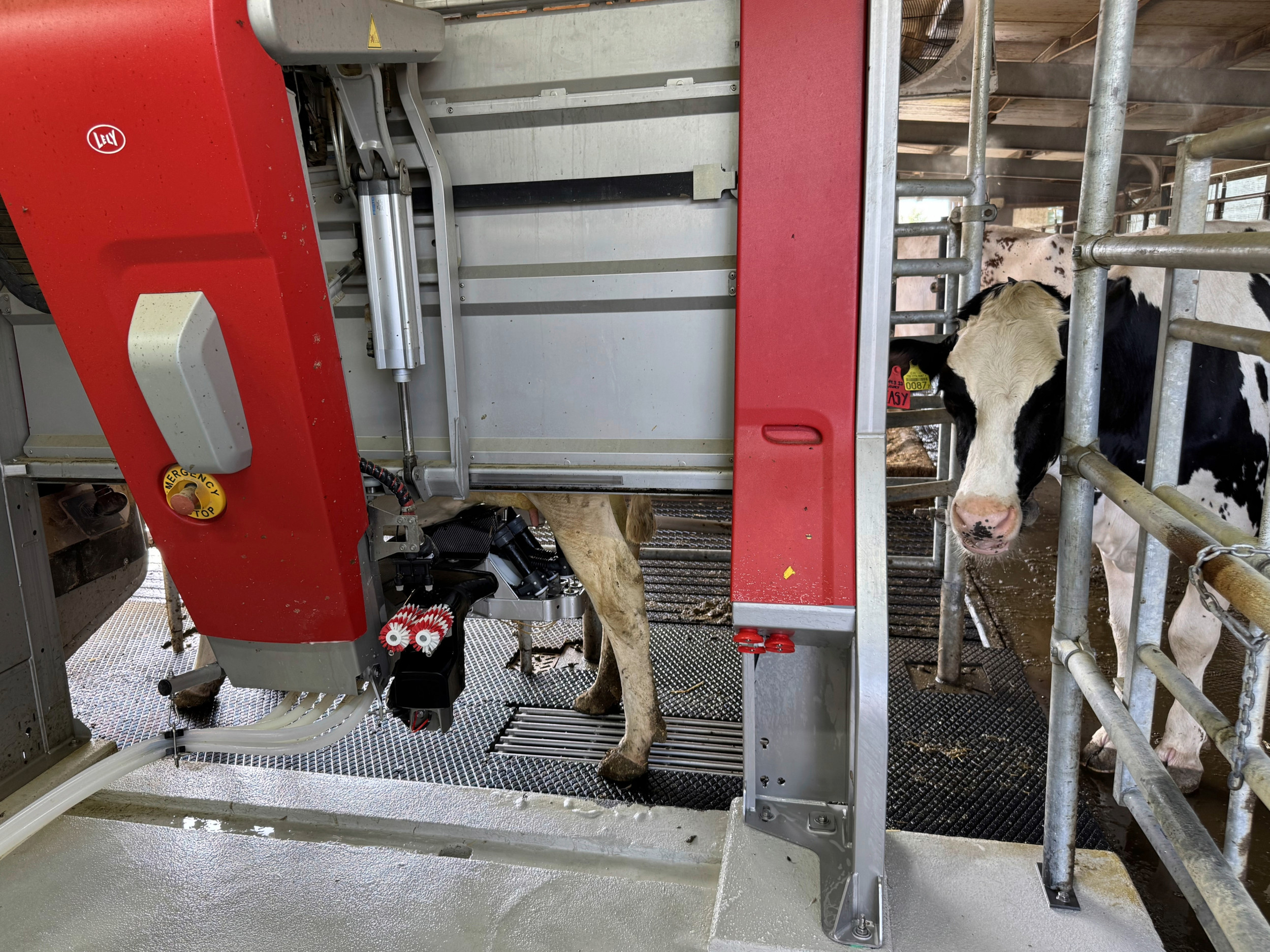 Die Kühe werden in einem Laufstall gehalten und werden am Roboter gemolken – im Durchschnitt drei Mal pro Tag. Dabei misst das System verschiedene Gesundheitsindikatoren wie Zellzahl, Leitfähigkeit und Wiederkauverhalten. «Wir züchten auf gute, leistungsstarke und gesunde Kühe», erklärt Betriebsleiter Urs Horni. «Dafür muss aber alles stimmen – wir investieren daher viel in Komfort, Tierwohl und Hygiene», ergänzt er.