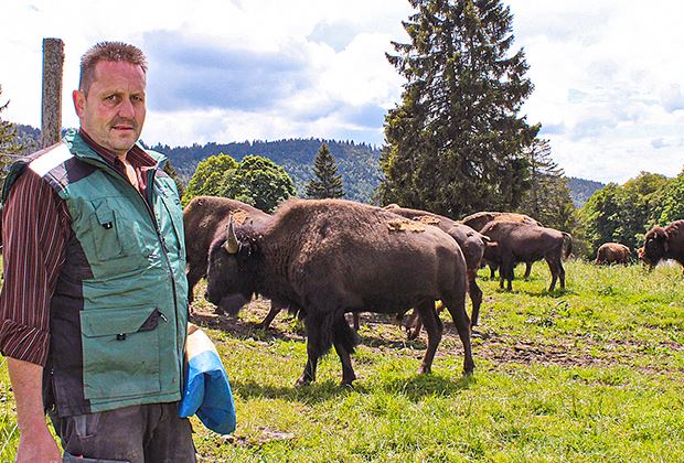 "Hey, hey» ruft Christian Lecomte aus voller Kehle in eine scheinbar nur aus Bäumen und Gräsern bestehende Landschaft. Die Wiese auf der er steht, hat in der Mitte eine leichte Erhöhung, so dass man nicht bis ans andere Ende sehen kann. «Hey, hey» wiederholt er seinen lauten Ruf und streut dabei ein wenig Kraftfutter über den Boden. Und auf einmal machen sich am Horizont einige braune Flecken bemerkbar, die immer grösser werden und sich schnell auf Lecomte zubewegen. Das Hufgetrampel ist immer deutlicher hör-, ja sogar spürbar. Man ist froh, hinter einem Gehege zu stehen, um sich vor dem schnellen Herannahen dieser bis zu 1,3 Tonnen schweren Bisons in Sicherheit zu wähnen. Inspiriert von dieser Szene stellt man sich vor, wie sich wohl ein Indianer mit Pfeil und Bogen einst gegen diese Bisons durchzusetzen vermochte. Denn die Heimat dieser Präriebisons ist Nordamerika.