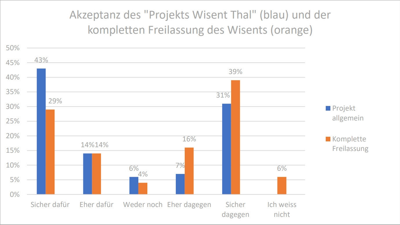 Akzeptanz der Bevölkerung auf Fragen zum Projekt allgemein (blau) und zu einer vollständigen Freilassung von Wisente (orange).