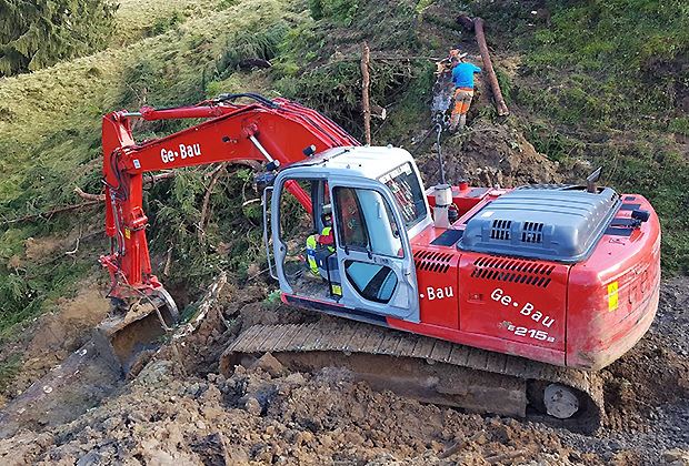 Aufgrund der Bauarbeiten wurden am Marchzaun entlang vier Tannen gefällt. Wir glaubten, dass die Rinder diese Stelle nicht passieren würden. Deshalb erstellten wir keinen provisorischen Zaun. Wir wollten warten, bis der Strassenbau weiter fortgeschritten war. Nun wurden wir eines besseren belehrt und handelten, so dass die Rinder künftig bei uns bleiben.