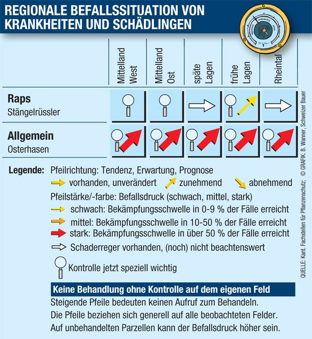 In den frühen Lagen sind vor allem in den Blattstielen, vereinzelt auch am Haupttrieb, Einstiche zu finden. In der nächsten warmen Periode werden die Stängelrüssler mit der Eiablage beginnen. Ob eine Behandlung Sinn macht, lässt sich nur anhand von Kontrollen beurteilen. Hat das Stängelwachstum eingesetzt und finden sich bereits auf mehr als zehn Prozent der Pflanzen Einstichstellen an den Stängeln, ist eine Bekämpfung angezeigt. Beachten Sie, dass Einstichstellen an den Blattstielen nicht mitgezählt werden, sie verursachen keine ertragswirksamen Schäden.