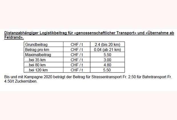 Die drei bisherigen Übernahmemodelle «individueller Transport», «genossenschaftlicher Transport» und «ab Feldrand» bleiben weiterhin bestehen. Für den genossenschaftlichen Transport und ab Feldrand wird ab 2021 anstelle des fixen Beitrages von 2.50 Fr. für Strassentransport und 4.50 Fr. für Bahntransport ein distanzabhängiger Logistikbeitrag unabhängig der Transportart eingeführt. Damit wird in Regionen mit gemischten Abfuhren die Gleichbehandlung aller Pflanzer sichergestellt, schreibt die Interprofession. Beim individuellen Transport bleiben die Entschädigungen wie im Jahr 2020.