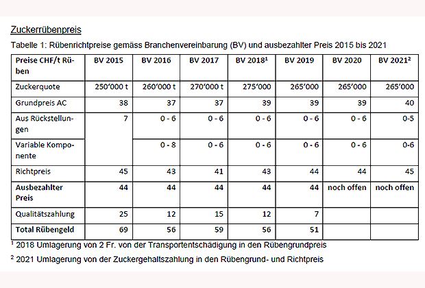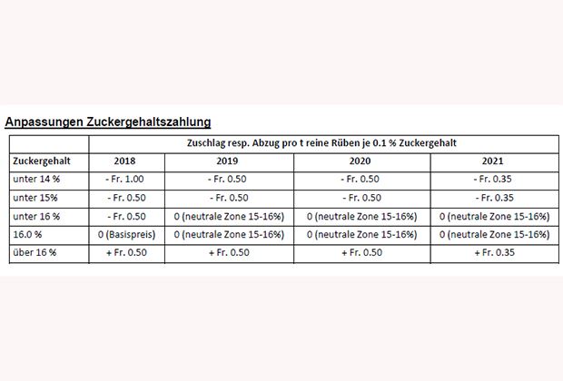 Zur Planungssicherheit für die Produzenten hat die Interprofession die Branchenvereinbarung 2021 bereits verabschiedet. So wurde eine Senkung der Bonus-Malus-Zahlung des Zuckergehaltes auf +/- 0.35 Fr./0.1% Zuckergehalt beschlossen. Die neutrale Zone zwischen 15 und 16% bleibt bestehen. Zur Kompensation wird sowohl der Grund- wie auch der Richtpreis um 1 Fr. auf 40 resp. 45 Fr./t erhöht.