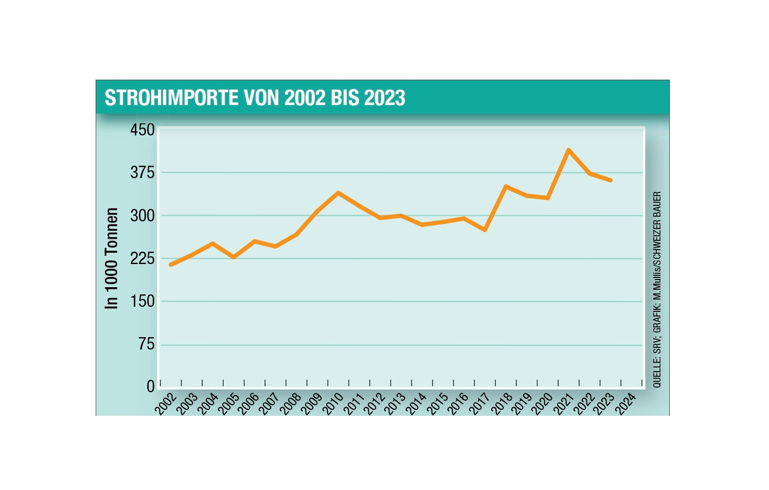 Die in der Schweiz anfallende Strohmenge reicht bei Weitem nicht aus, um die stetig steigende Nachfrage zu decken. Die Strohimporte haben in den letzten Jahren stark zugenommen (siehe Grafik). Waren es im Jahr 2002 noch rund 200’000 Tonnen Stroh, die importiert wurden, so sind es mittlerweile über 350’000 Tonnen jährlich. Davon sind 50’000 Tonnen verarbeitete Strohprodukte, Tendenz steigend.